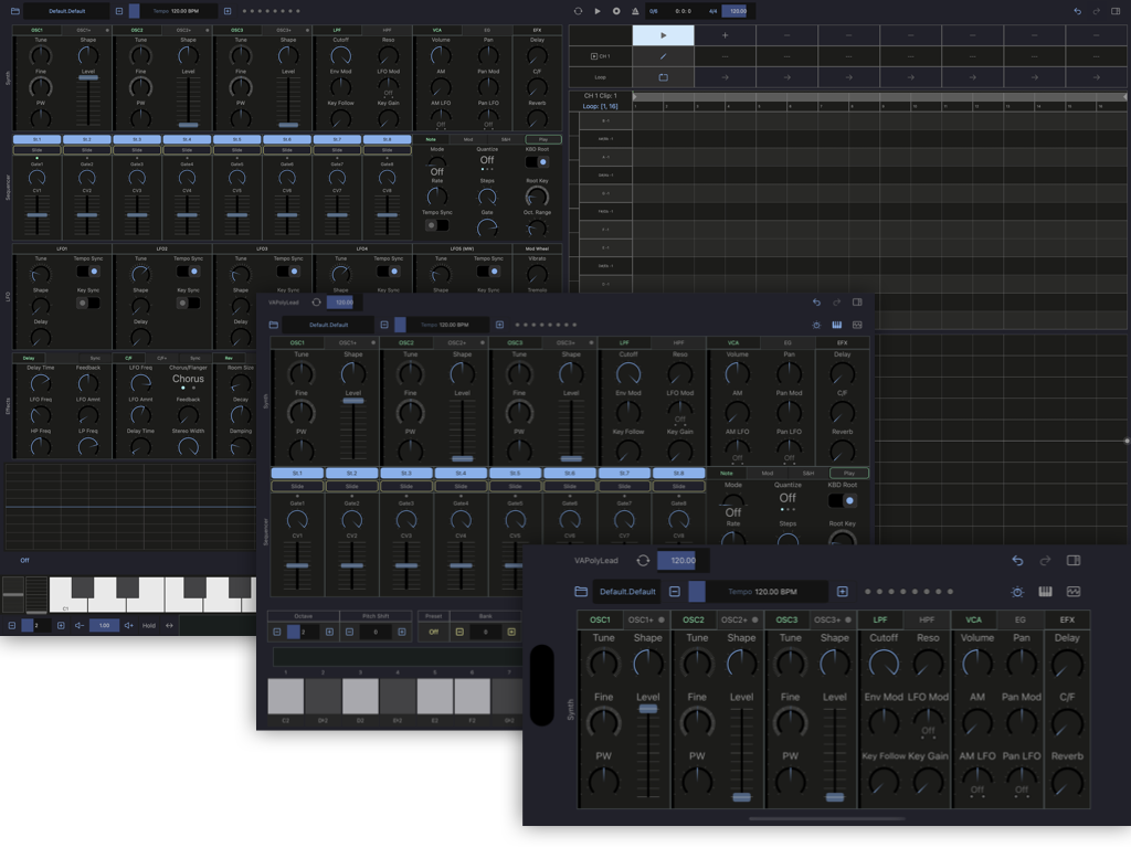 VAPolyLead features 3 channel analog style step sequencer and a VCF modeled on sallen-key filter of iconic monophonic synthesizer in 1970’s. VAPolyLoop operates as a stand alone or as an AudioUnit Extension (AUv3) for iPhone, iPad and Mac. Stand Alone supports Ableton Link, MIDI and audio file export. Project files can be saved in iCloud Drive, so that the project can be accessed from iPhone, iPad or Mac.