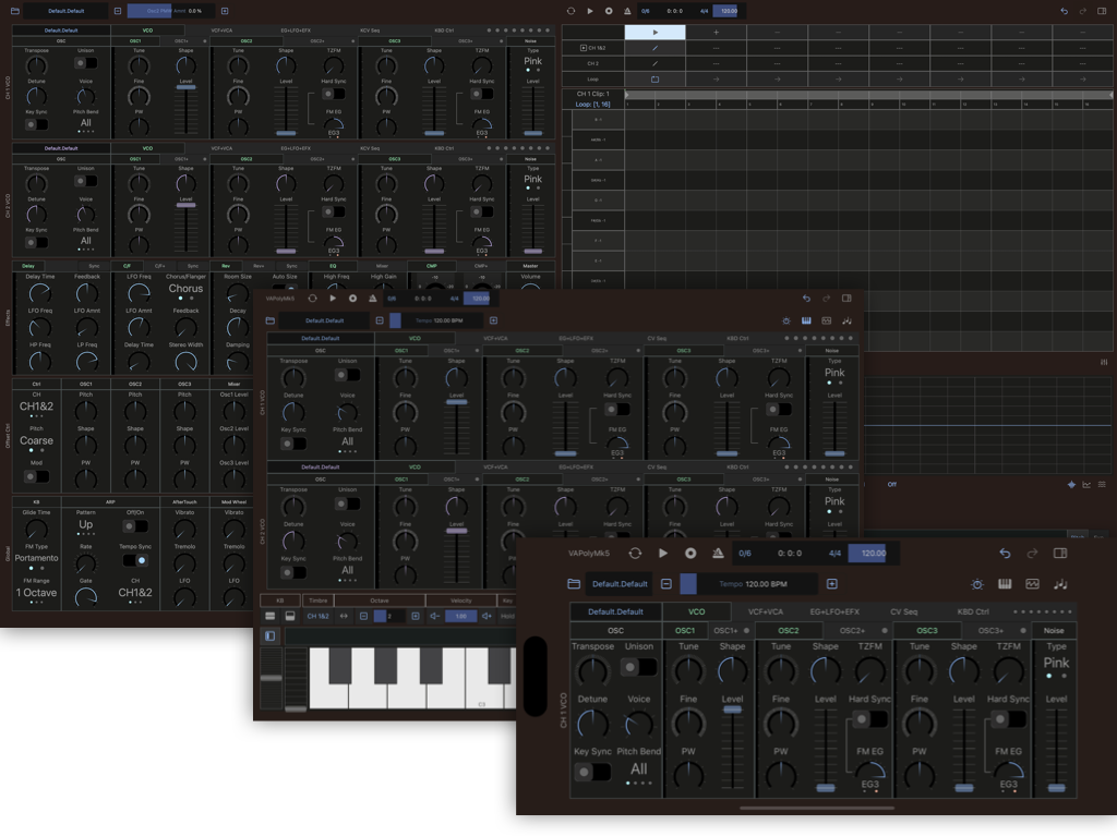 VAPolyMk5 operates as a stand alone or as an AudioUnit Extension (AUv3) for iPhone, iPad and Mac. Stand Alone supports Ableton Link, MIDI and audio file export. Built-in Effects include delay, chorus, flanger, reverb, eq and compressor. Project files can be saved in iCloud Drive, so that the project can be accessed from iPhone, iPad or Mac.